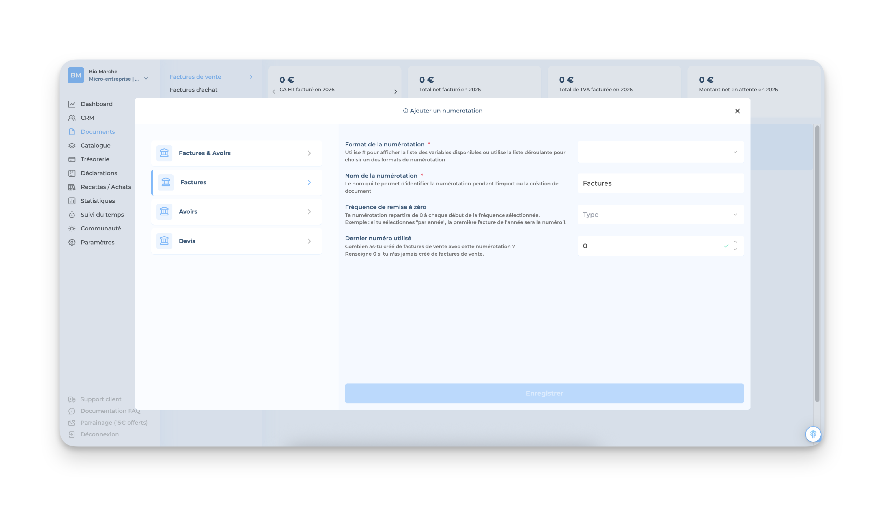 👉🏻 Si tu viens de t'inscrire sur Freebe & que tu n'as pas encore créé de document, tu devras configurer ta numérotation au moment de la création de ce dernier :