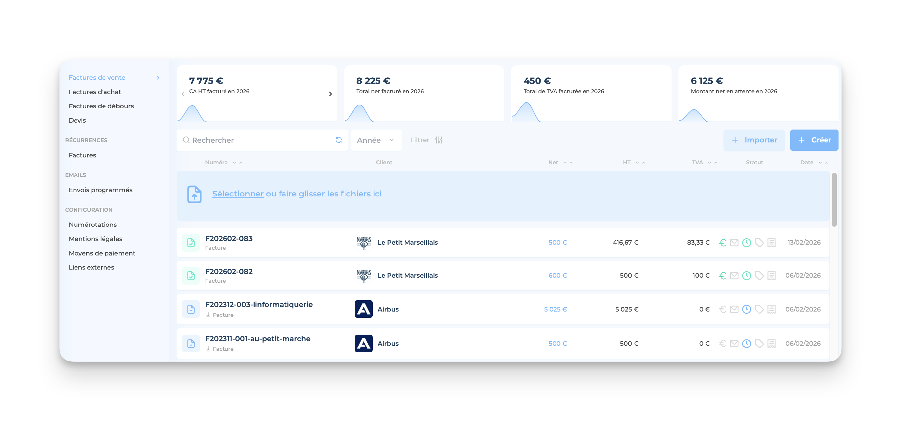 👉🏻 Pour commencer, tu dois Importer la facture de débours dans l'onglet Documents > Factures de débours en cliquant sur Importer (1) ou en glissant-déposant le fichier (2) :