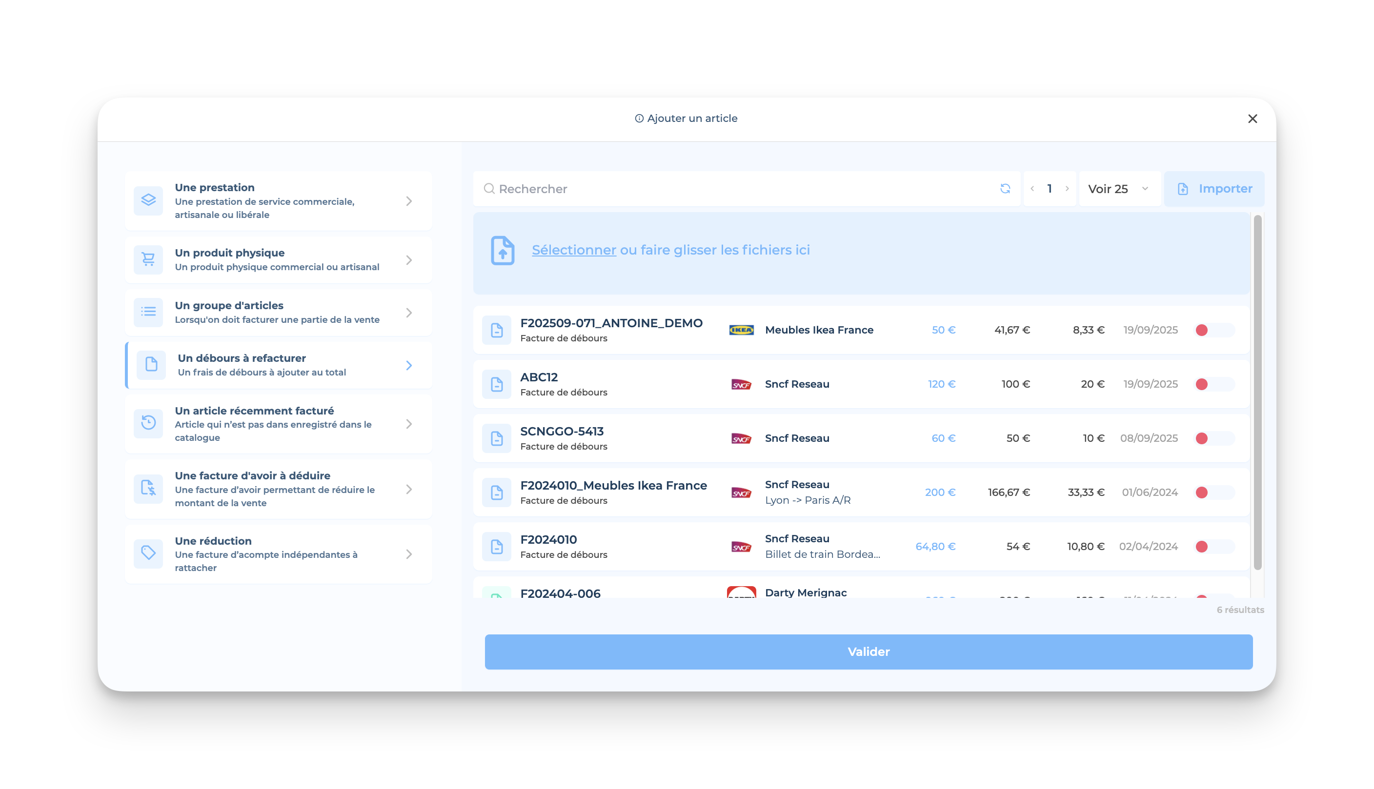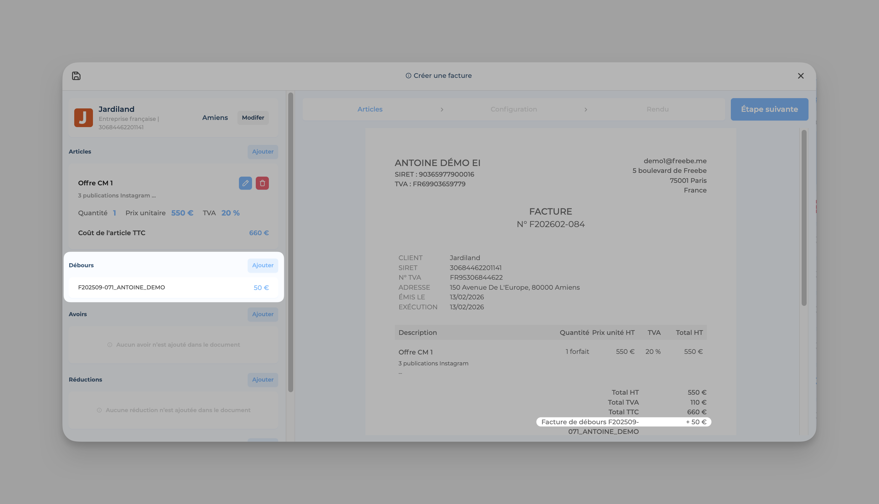☝🏻 Tu peux ensuite cliquer sur Ajouter à droite de l'onglet Débours et/ou Articles, afin de compléter ton document. Tu pourras ensuite suivre les étapes nécessaires à la création de ta facture.