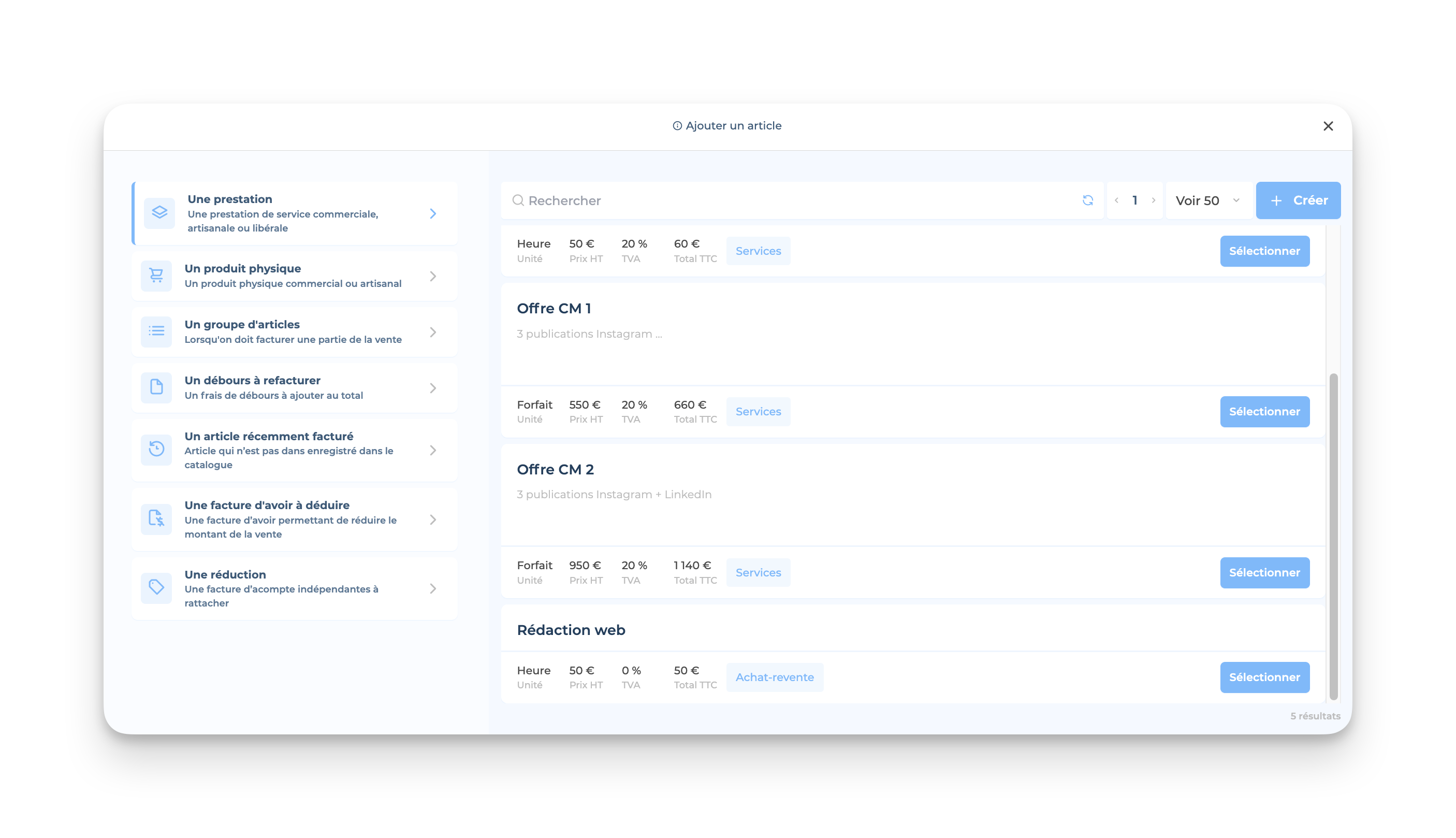 👉🏻 Tu peux ensuite sélectionner la ou les prestations à facturer, puis cliquer sur Sélectionner :