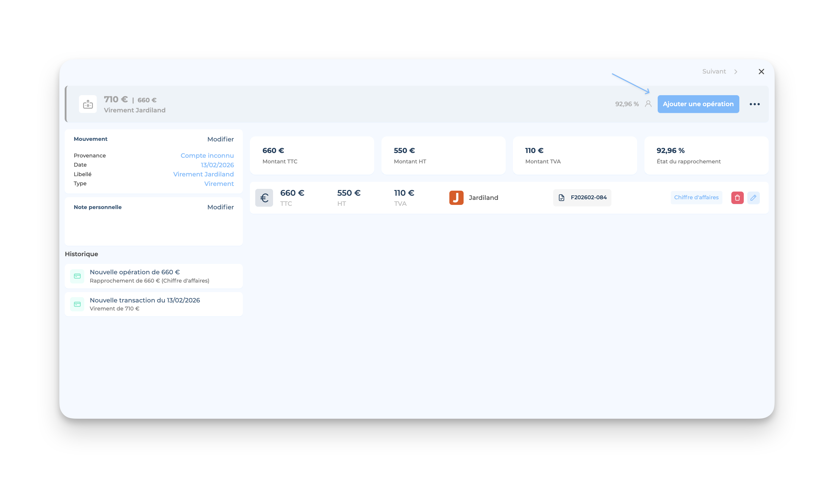 👉🏻 Rends-toi dans l'onglet Trésorerie, puis depuis l'encaissement concerné, clique sur « Ajouter une opération » :
