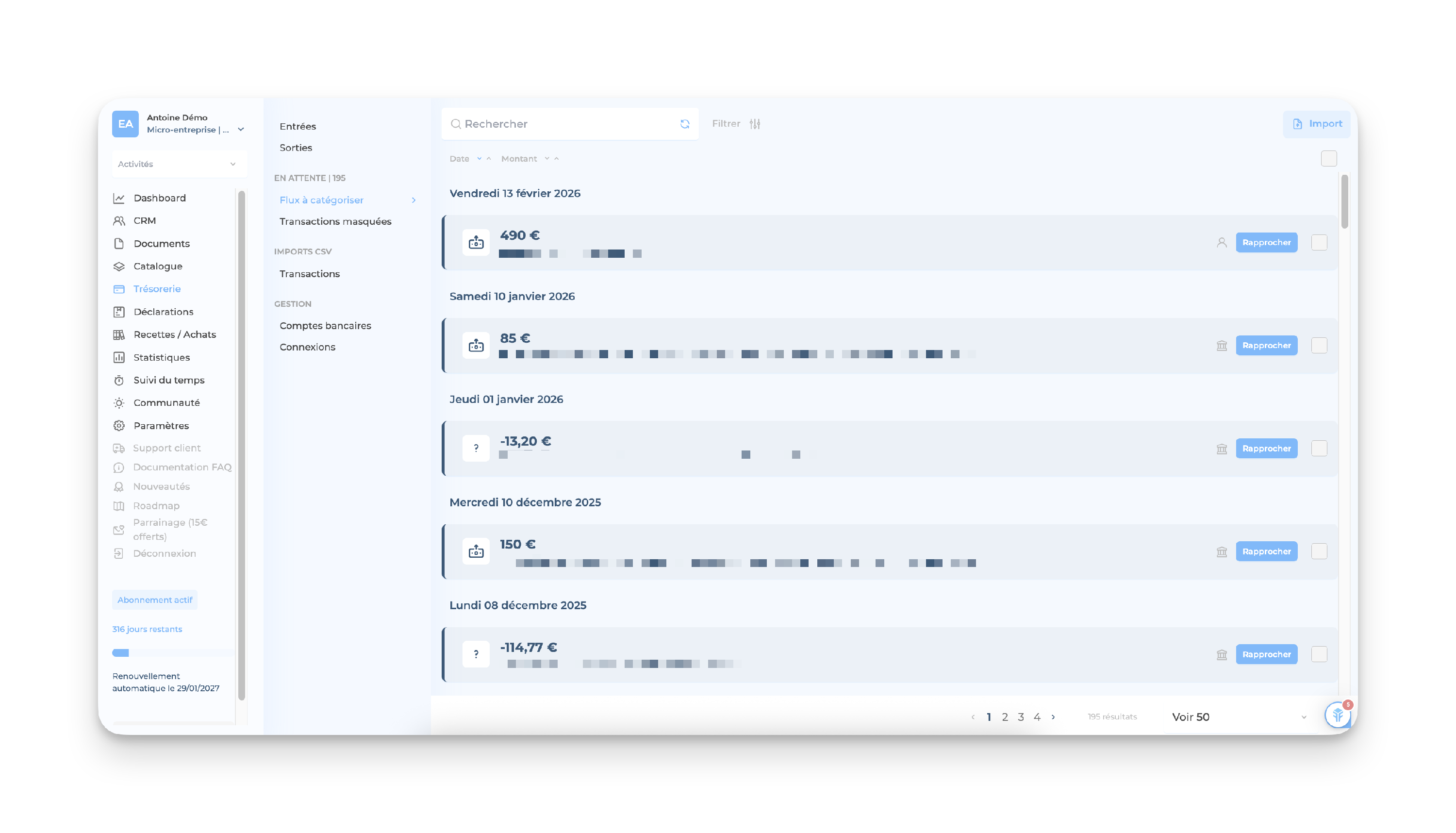 👉🏻 Depuis cet onglet, tu pourras ensuite Rapprocher tes mouvements bancaires pour lier tes factures aux transactions & mettre à jour tes statistiques (CA, cotisations, TVA, livre des recettes/achats, etc.).