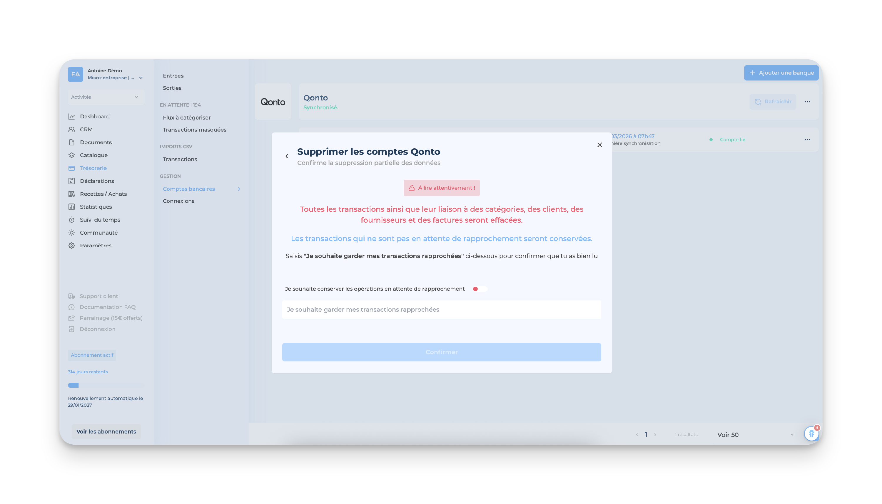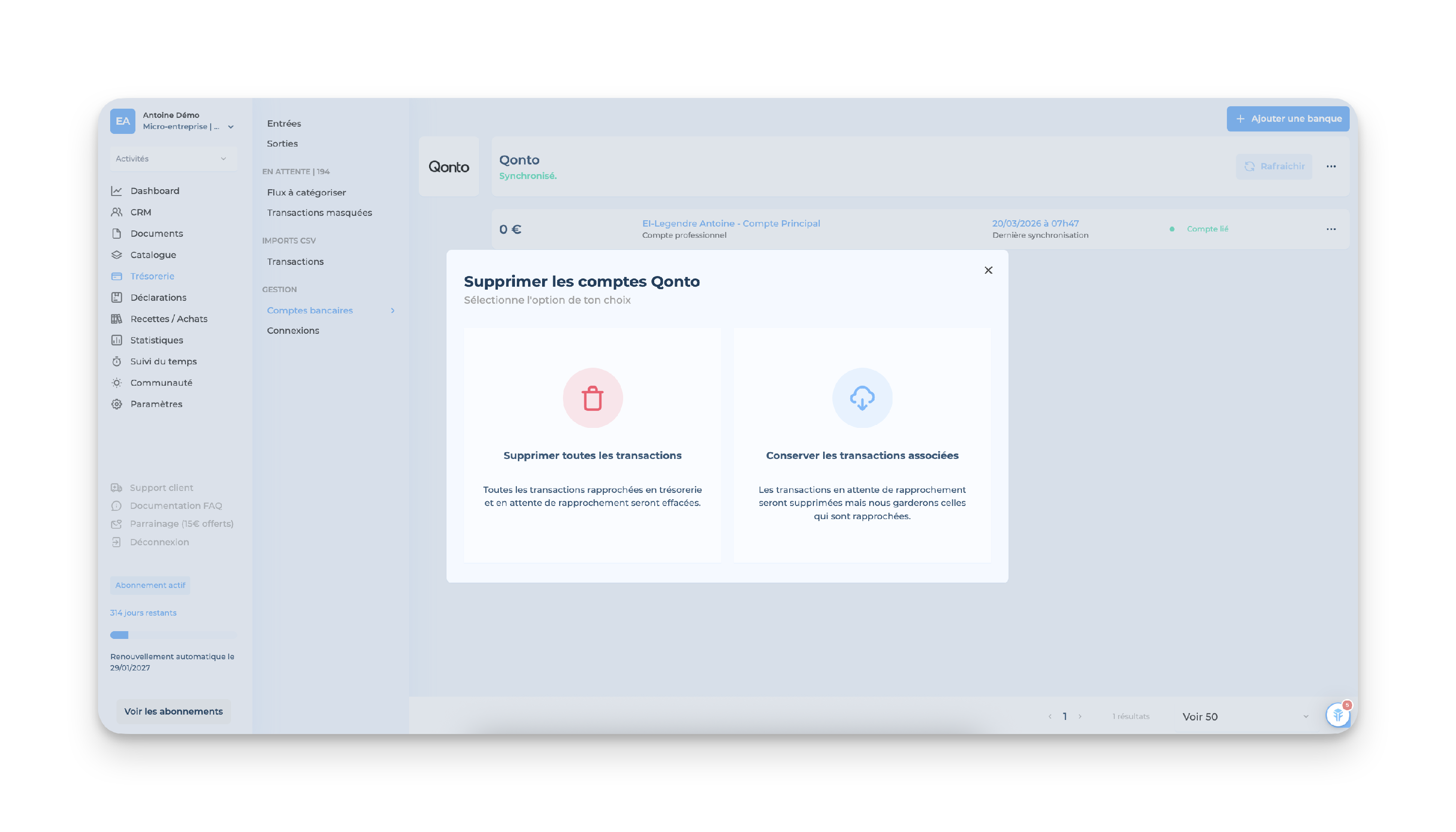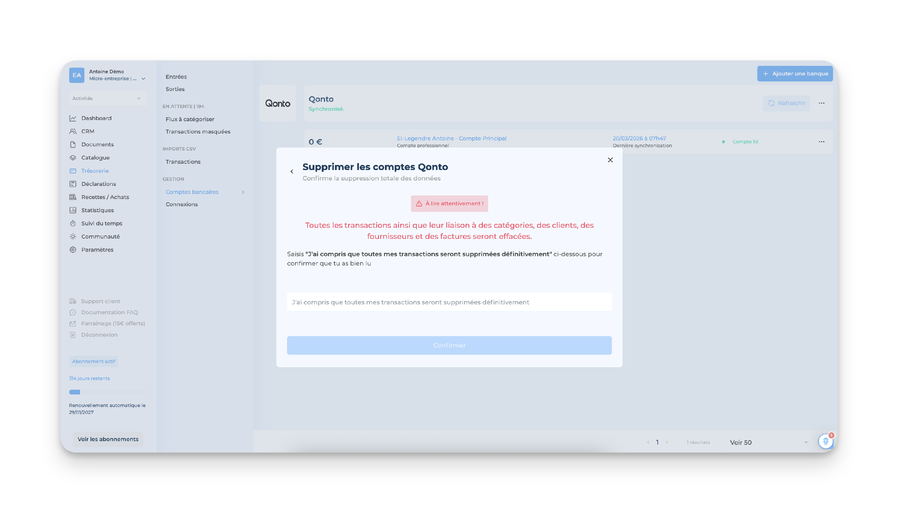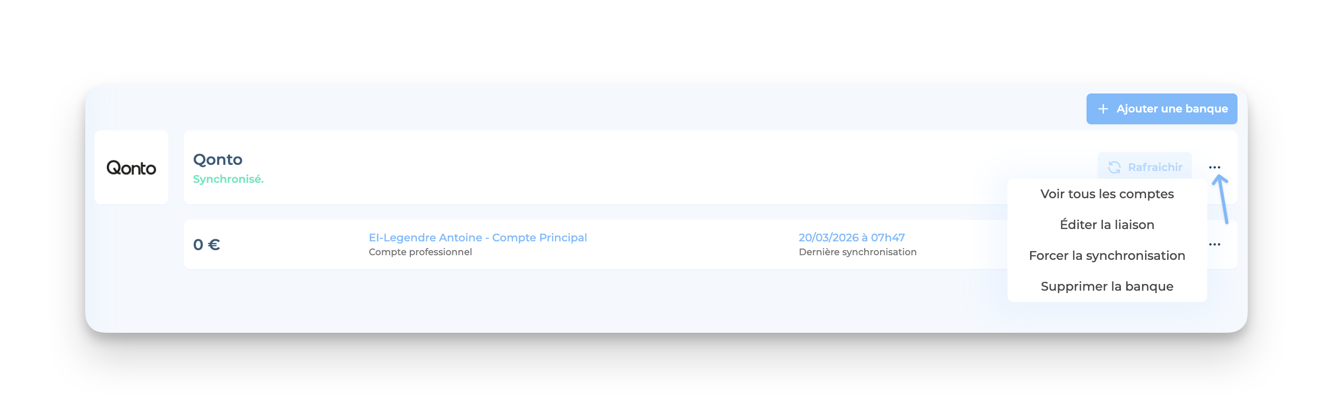 Après avoir synchronisé ton compte bancaire, il est possible de revenir en arrière et de le supprimer en cas de changement de compte ou d'erreur.