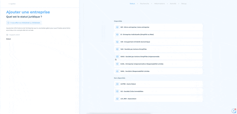 ⚠️ Freebe ne gère pas les statuts suivants : LMNP, SCI, ASSOCIATION, MICRO-BA, SA, SAERL, Intermittent, Activités Réglementées.