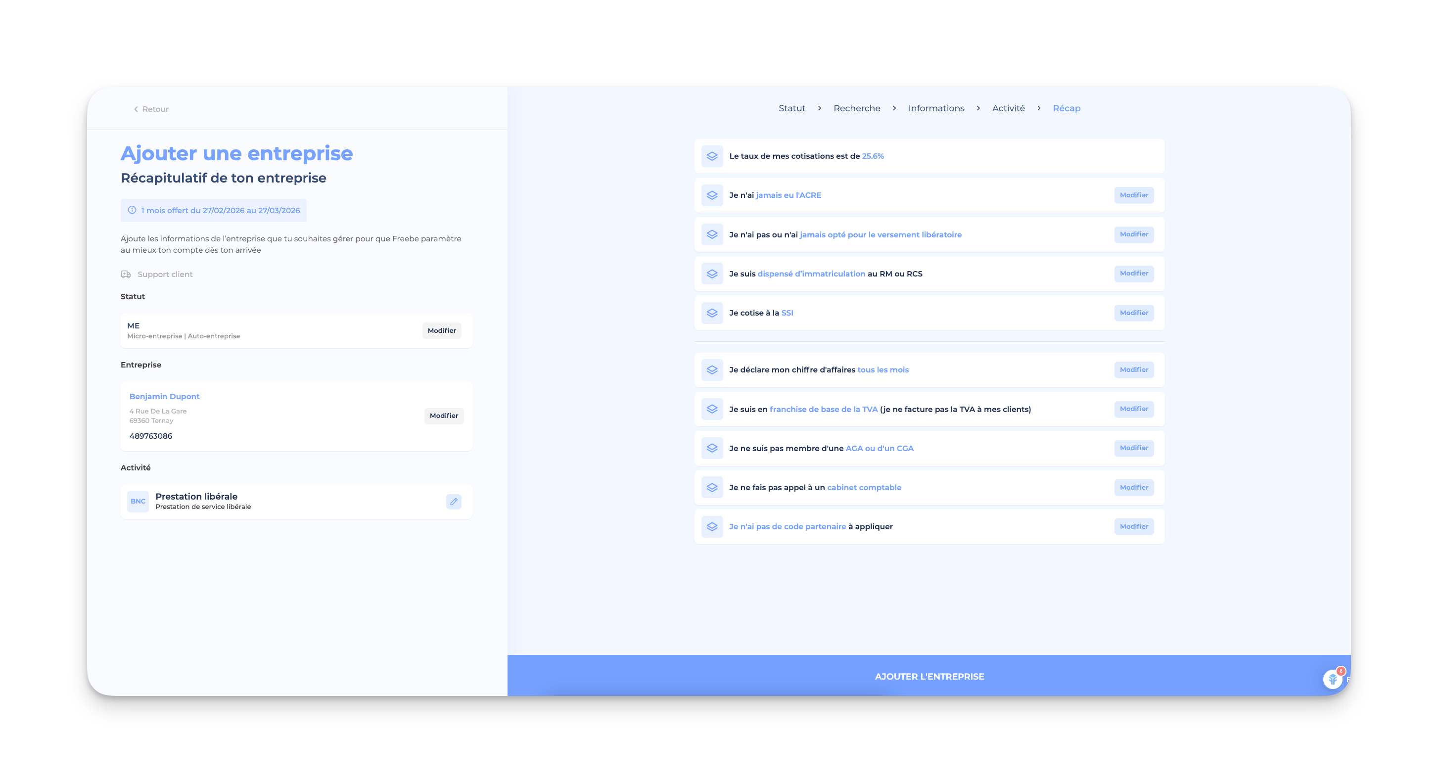 👉🏻 Avant de valider l'ajout de ton entreprise, Freebe te demandera de vérifier les informations liées à ta fiscalité et au calcul de tes cotisations (caisse de retraite, ACRE, versement libératoire, ...) :