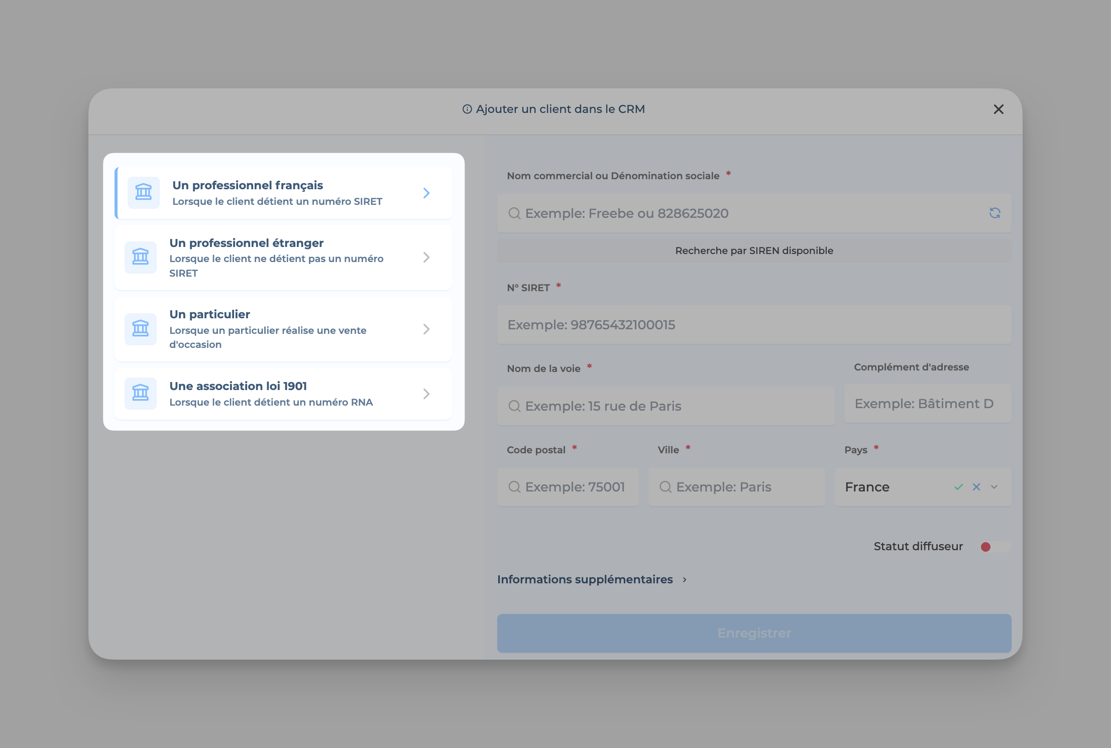 👉🏻 Tu peux alors rechercher ton client à partir de son nom, son n° SIREN ou SIRET ou encore son adresse. Freebe récupérera pour toi toutes ses informations légales et pré-remplira la fiche de ton client :