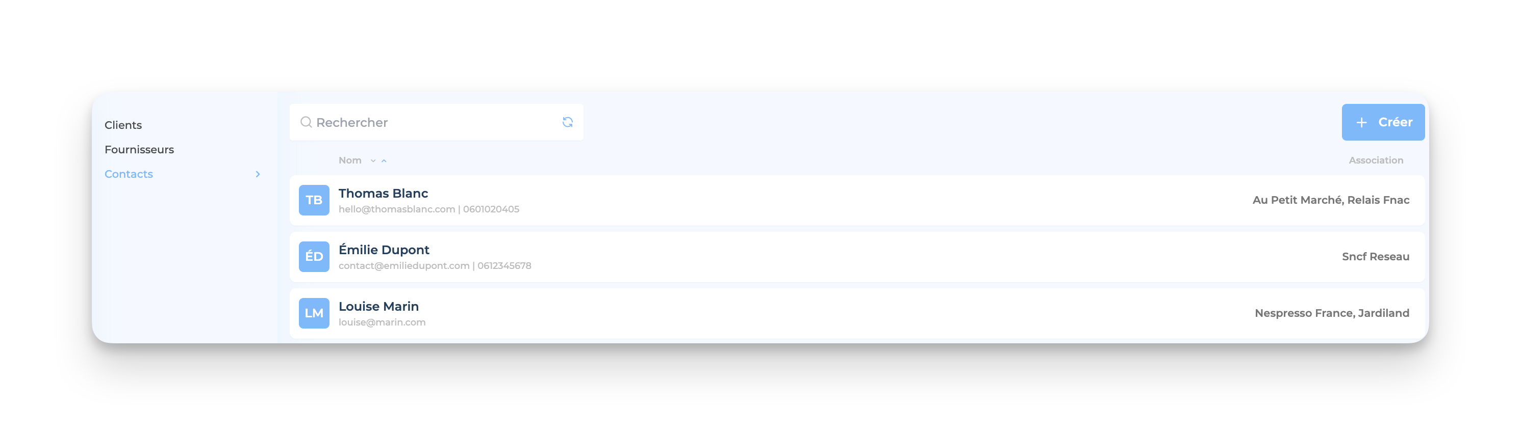 👉🏻 Rendez-vous sur l’onglet CRM → Contact dans le menu à gauche de ton espace Freebe, puis clique sur le bouton Créer :