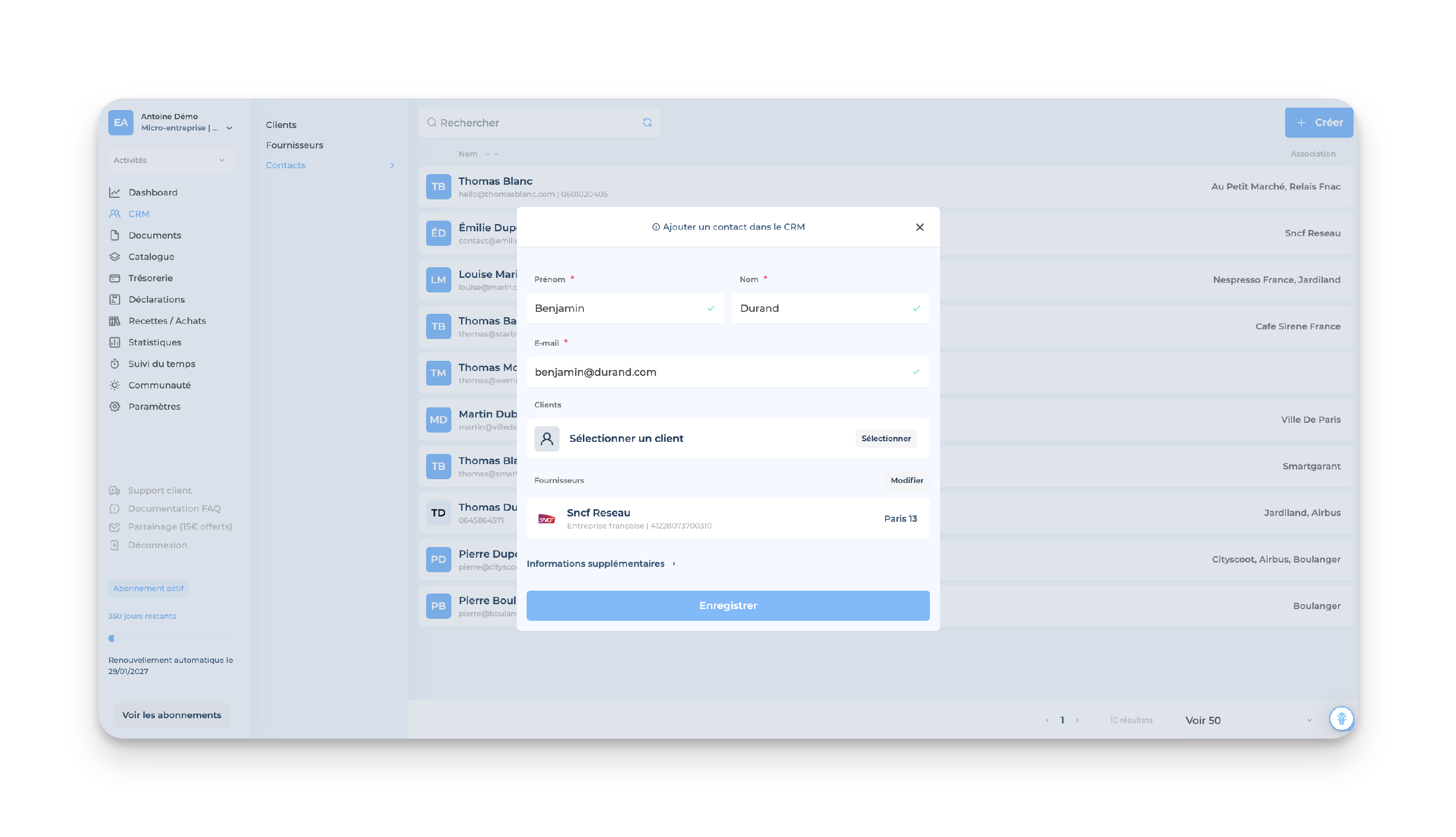 👉🏻 Remplis ensuite tous les champs obligatoires de la fiche contact, associe ton contact à l'un de tes clients/fournisseurs, puis clique sur Enregistrer pour valider la création :