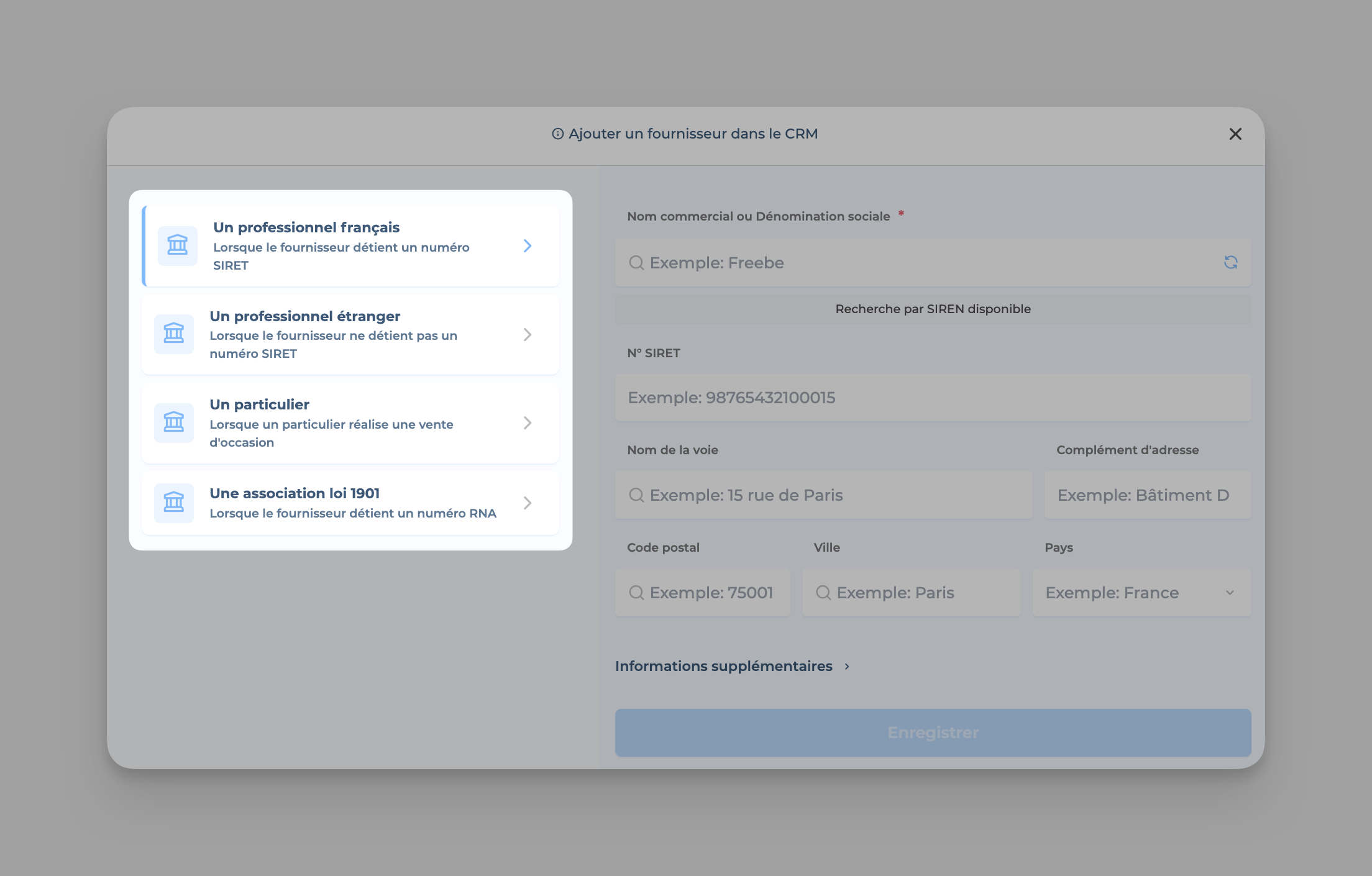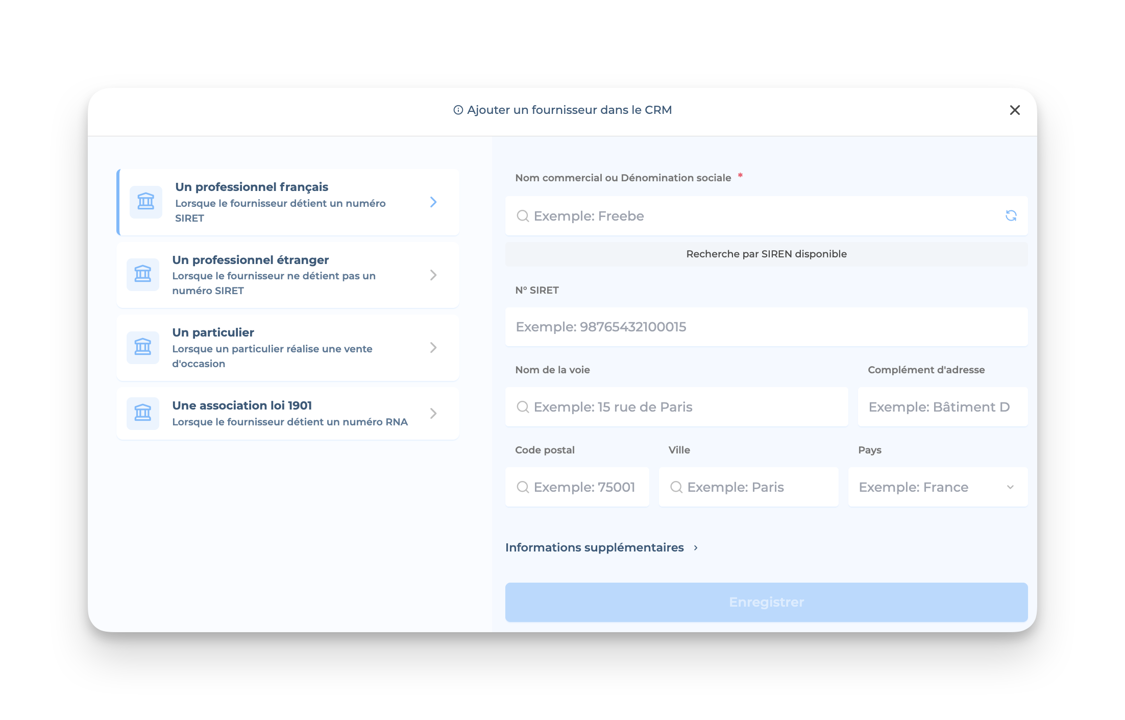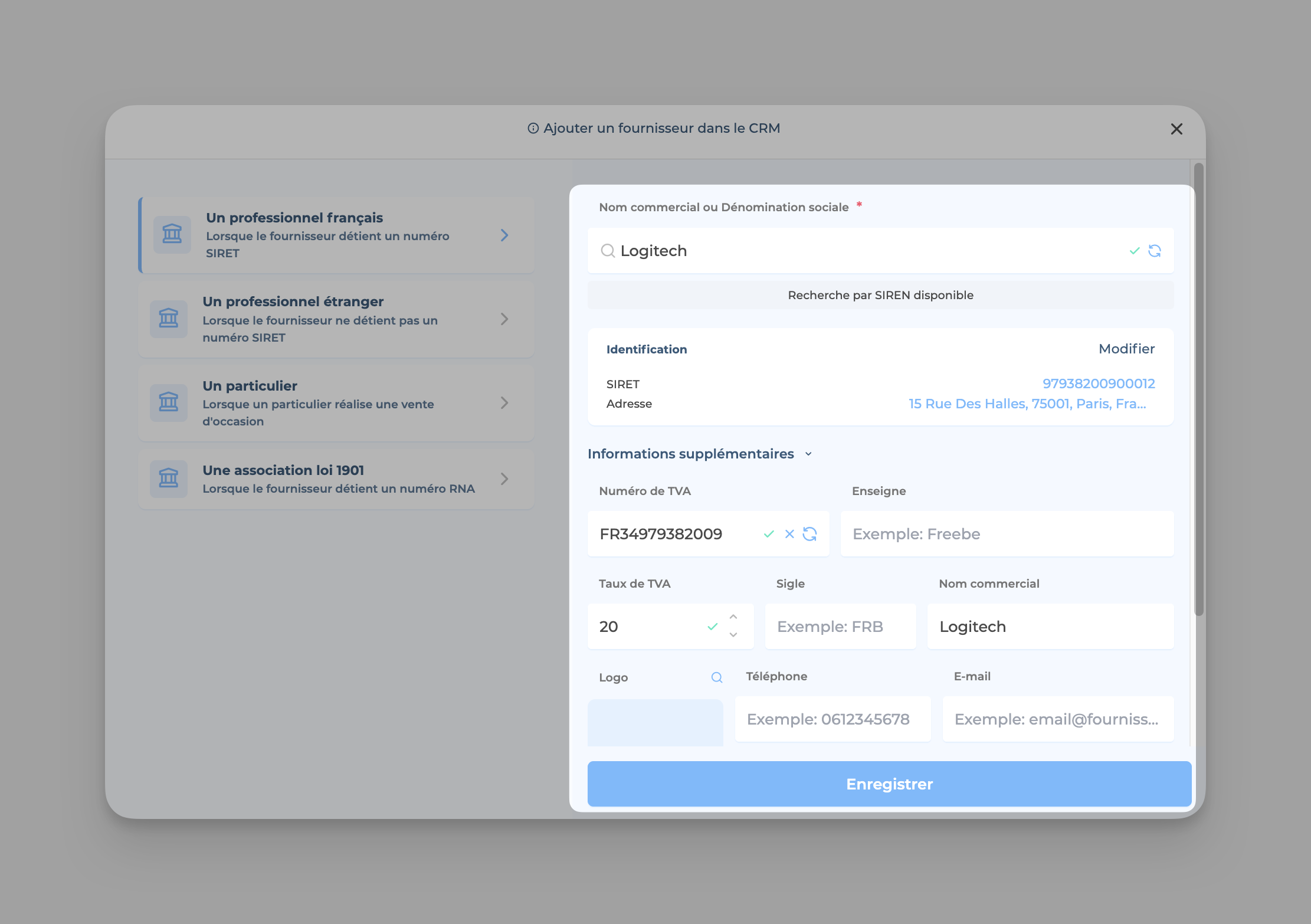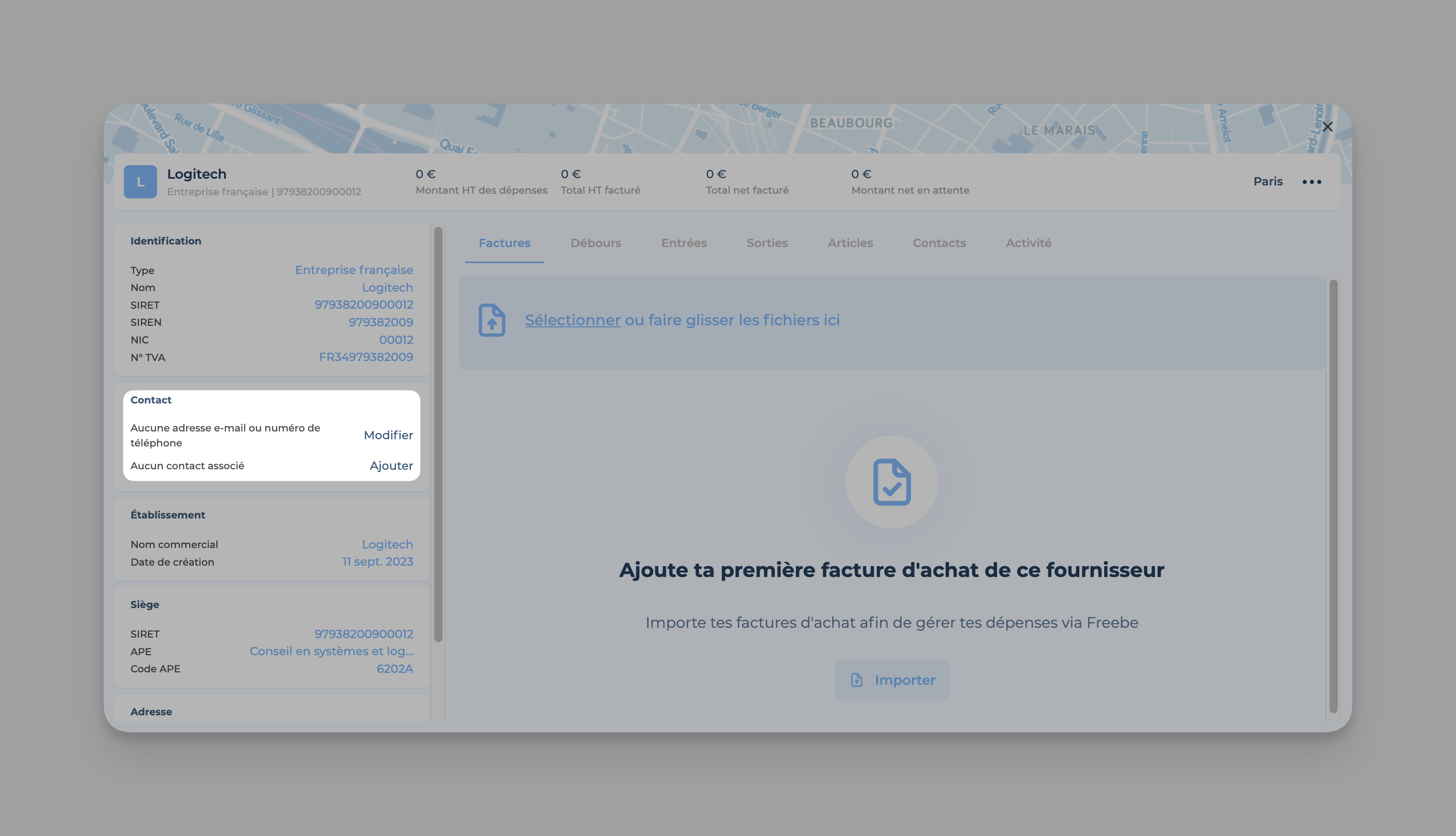 👉🏻 Tu pourras ensuite ton fournisseur à partir de son nom, son n° SIREN ou SIRET ou encore son adresse. Freebe récupérera pour toi toutes ses informations légales et pré-remplira la fiche de ton fournisseur :