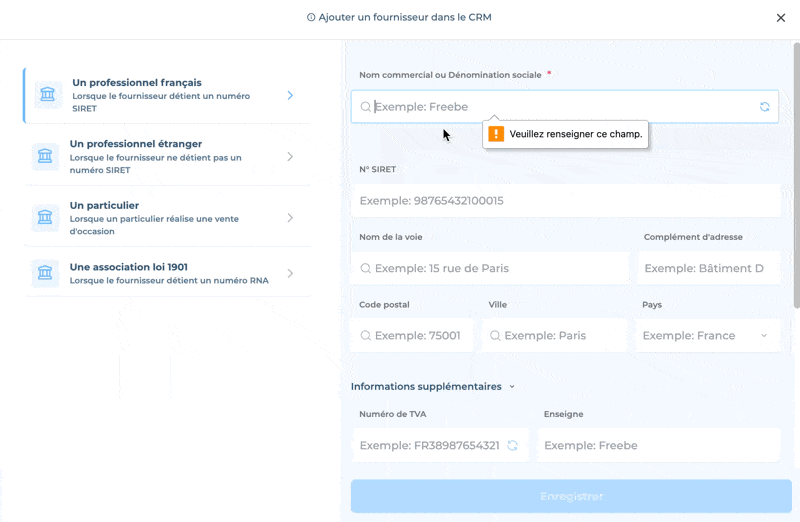 👉🏻 Vérifie ou modifie les informations de la fiche fournisseur. Si tout est ok, clique sur Enregistrer.